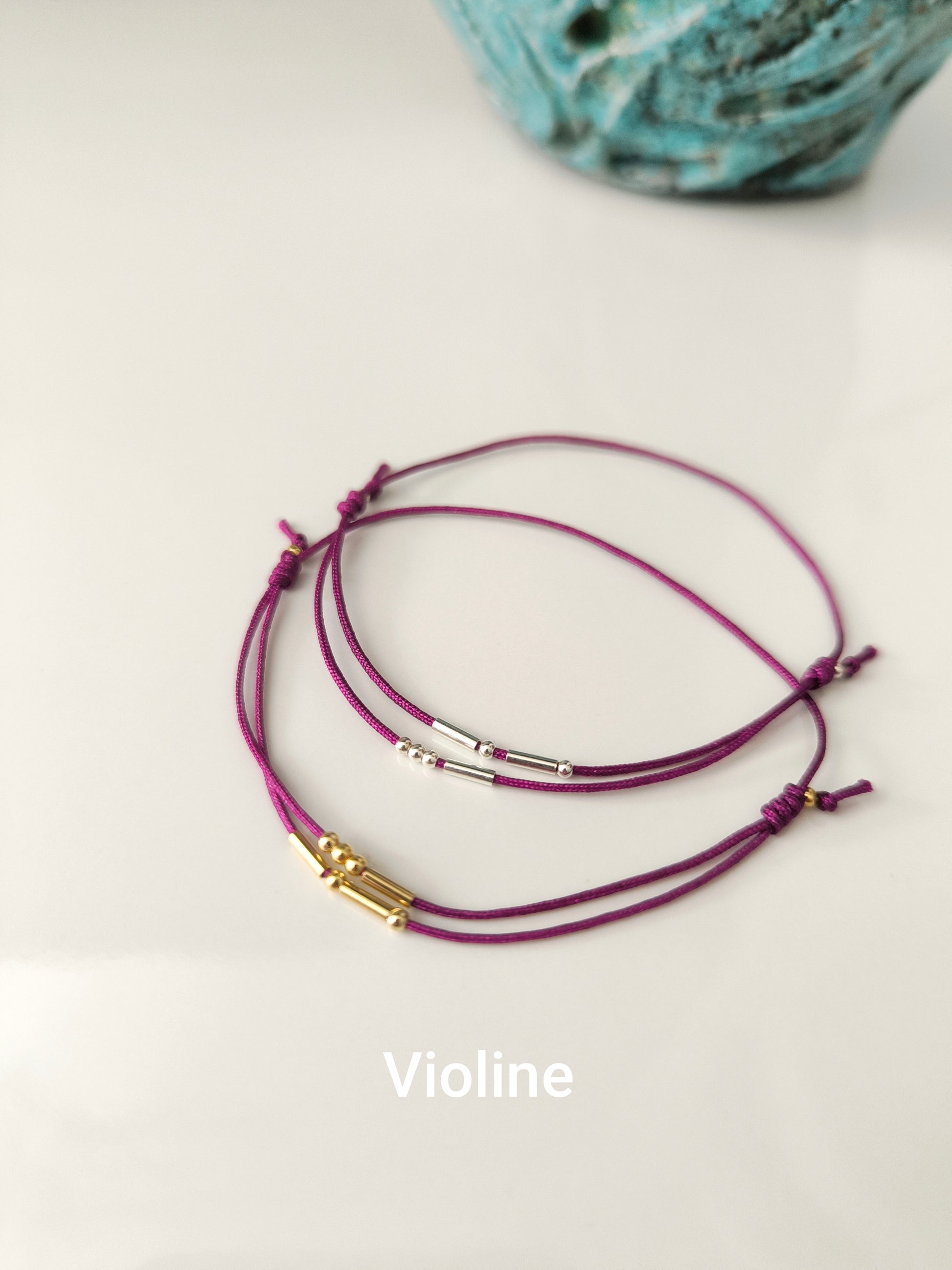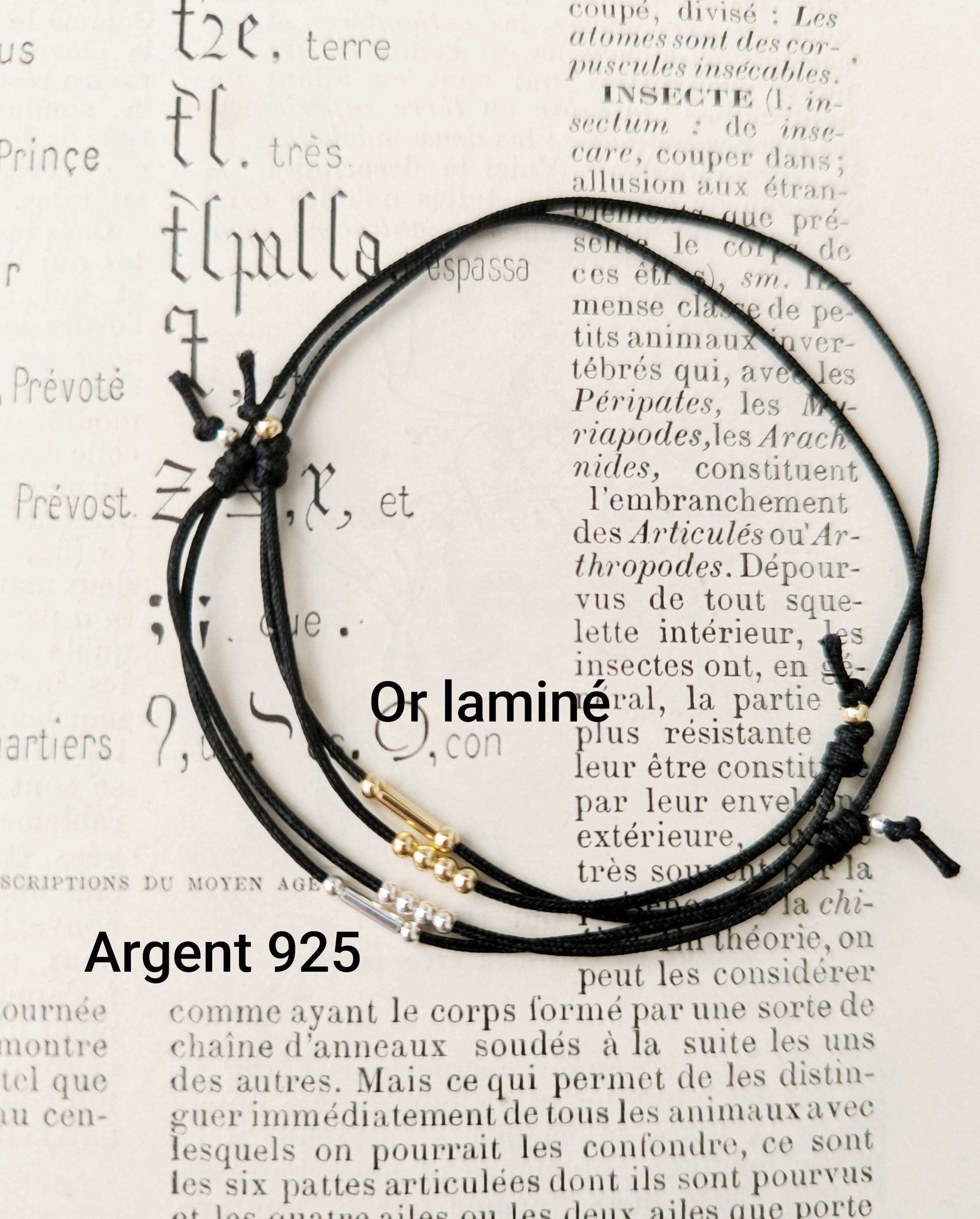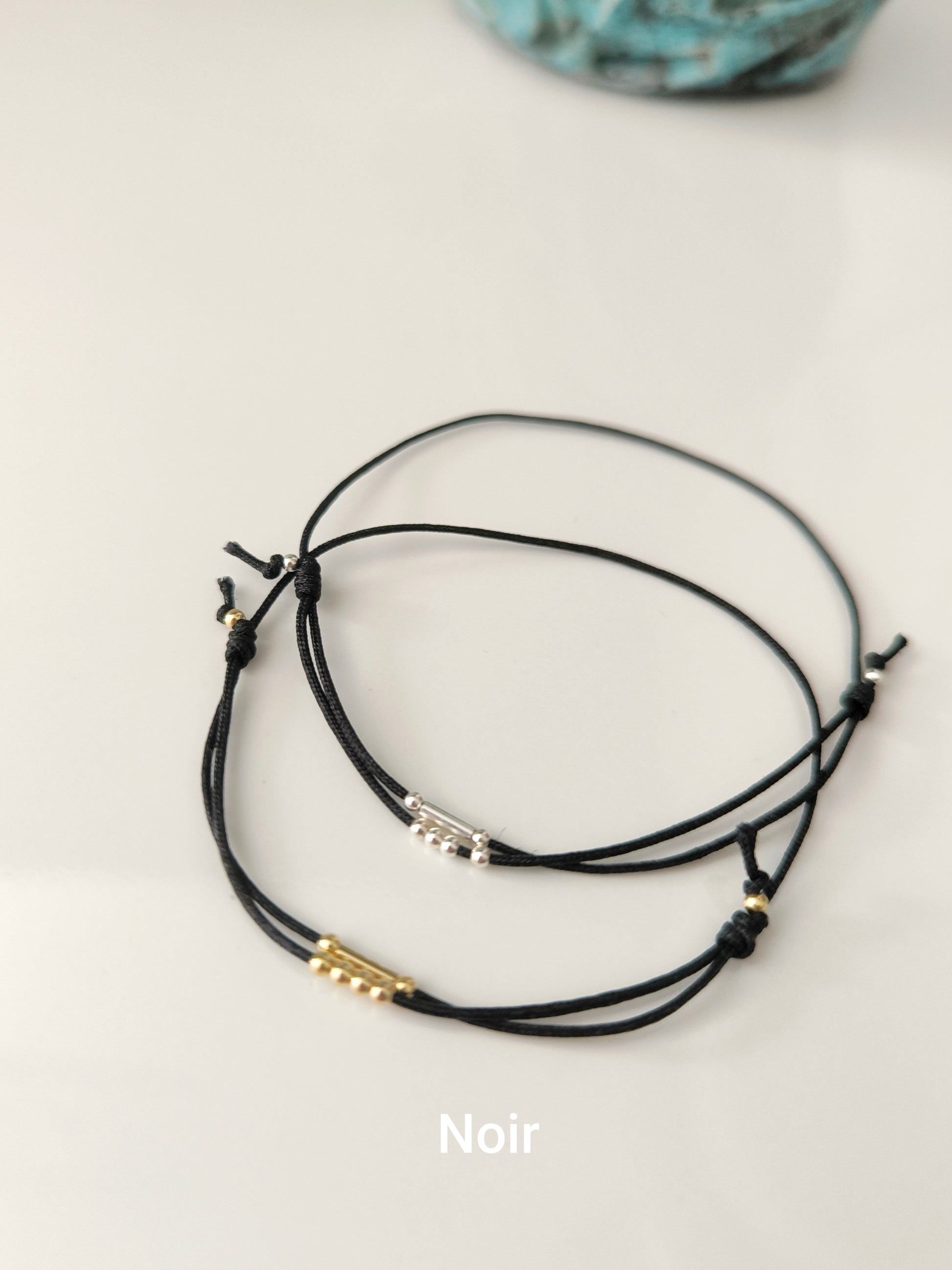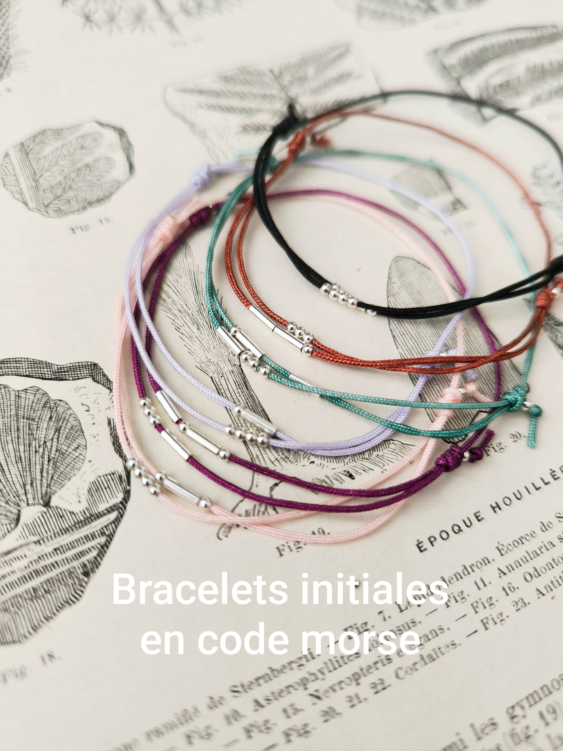 Bracelet personnalisé en cordon de "jade" très résistant, réglable avec initiales en code morse. En argent 925 ou or laminé au choix. Pour dire je t'aime, pour une amie, pour ses enfants...