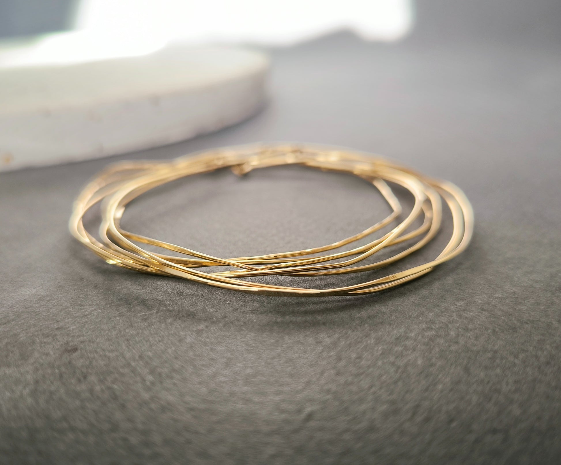Irréguliers et pleins de charme, ces bracelets jonc fins vous suivront partout : portez-les avec légèreté sur vos poignets nus, ou par dessus une manche de pull en maille en hiver..